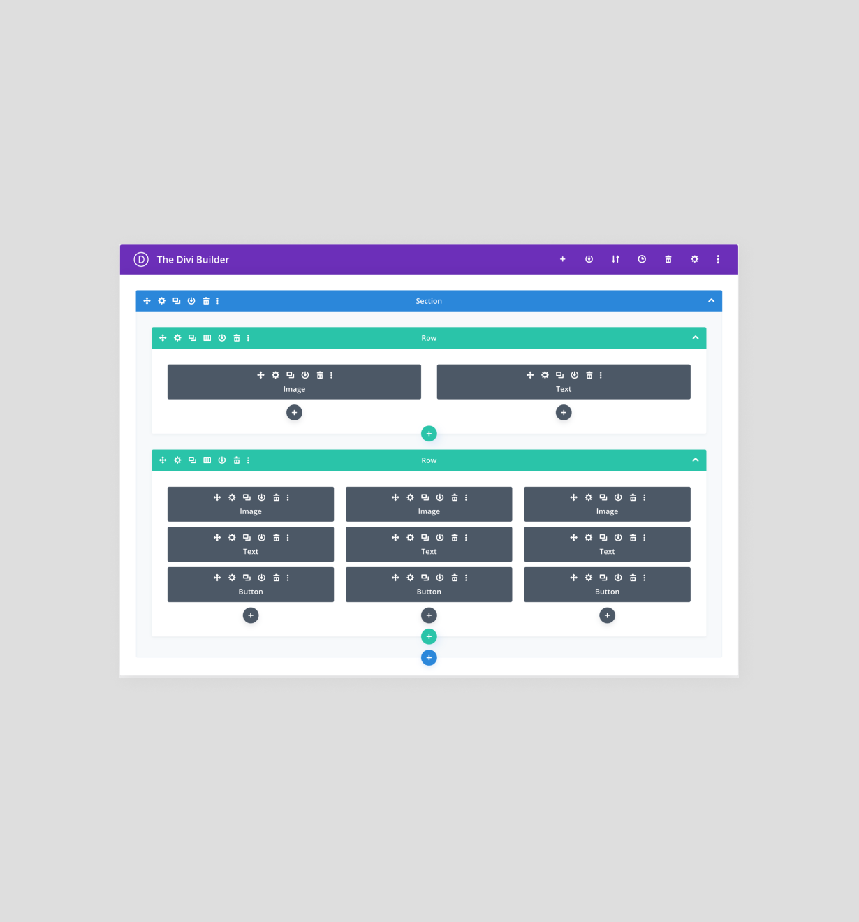 Ich habe das Wireframe-Konzept als Grundlage für das UI-Design verwendet und es mit Farben, Bildern, Icons und Texten erweitert. Dabei habe ich die Farbwelt des Divi Builders in der Wireframe-Ansicht leicht erweitert, um dem Nutzer durch klare Strukturen und Farben eine schnelle Orientierung zu ermöglichen.
